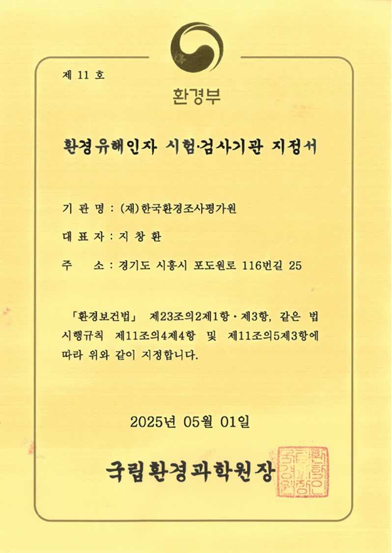환경유해인자 시험·검사기관으로 신규 지정되었습니다.
